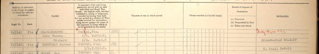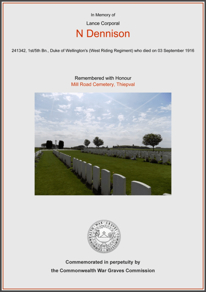 He enlisted in August 1915 with the Service Number 4528 into the 1st/5th Battalion Duke of Wellington’s (West Riding Regiment) rising to the rank of Lance Corporal and was sent to the Western Front on 7th August 1916. His Service Number was later changed to 241342. He was killed in action during the Battle of the Somme on 3rd September 1916 at Thiepval on a Salient known as the “Pope’s Nose”. He was buried in Mill Road Cemetery, Thiepval, Somme, France. Norman was awarded the British War Medal and the Victory Medal.