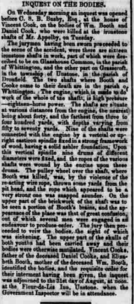 The initial inquest was held the following day – remarkably, this was at the house of Daniel’s father, Vincent Cooke, and the jury convened there. After a visit to the scene of the accident, the jury also viewed the bodies, ‘the sight of which was sickening. The upper part of their skulls had been carried away, and their bodies were otherwise mutilated’. For Vincent Cooke and Elizabeth Booth, called upon to identify their sons’ bodies, it must have been nothing short of completely horrific. The inquest was adjourned, to be re-convened at the Fleur-de-Lys Inn at Unstone, when the Government Inspector could also attend.