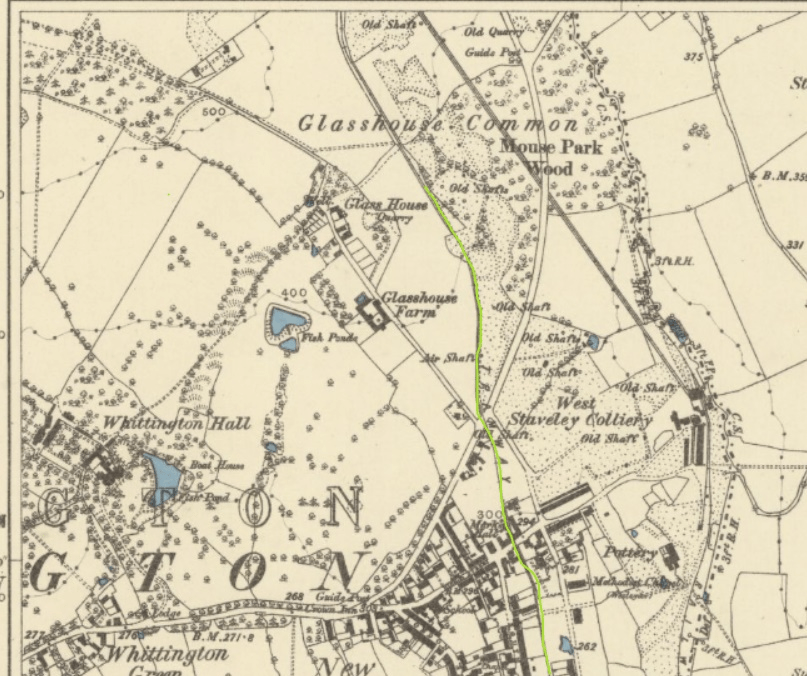 The 1883 map shows roughly where the colliery would be and the tramway which was built to take the coal from Grasscroft, Hundall and West Staveley collieries down to the railway line at the bottom of the village.