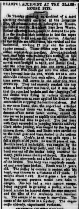 The engine-man applied his brakes and succeeded in stopping one of the drums, but the cog wheel attached to the other drum was broken. The sudden descent of the seven full corves caused the other two corves to ascend so rapidly that neither Daniel Cooke nor William Booth had time to get out. The other two boys with Daniel managed to jump out. James Clark also managed to jump but was ‘caught by the leg and thrown down’. Daniel and William were ‘carried up to the head gear and then dashed to the bottom of the pits’.
