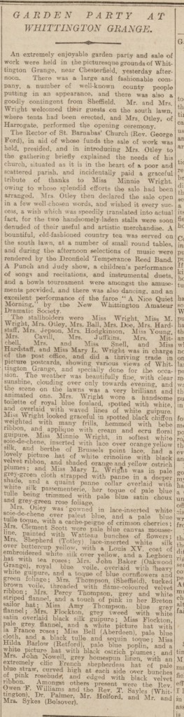 By 1911 Harry Brearley had also moved to Old Whittington, it is not hard to imagine the two men knew each other both being involved in the steel industry. Henry Wright took an active part in the life of Old and New Whittington opening the grounds of Whittington Grange for flower shows, garden parties and school treats as recorded in his obituary( South Yorkshire Times 30 August 1913). The newspaper reports below certainly paint a picture of how generous Henry Wright could be, some of these events do sound quite lavish affairs.