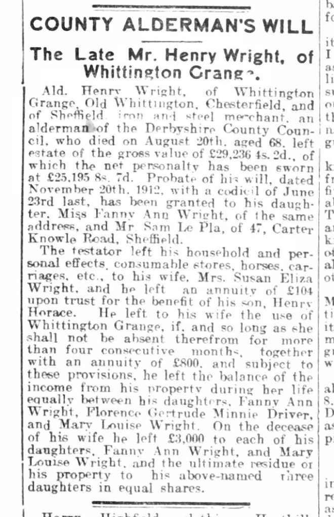 Details of Alderman Wrights Will were printed in the Derbyshire Courier 6 January 1914 and it confirms that Henry Wright was a very successful business man and had built up a considerable fortune.