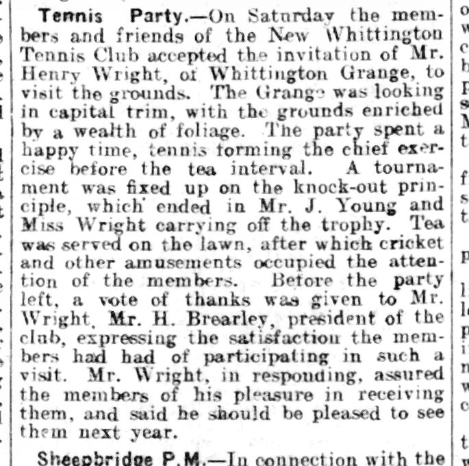 He was also involved with New Whittington Tennis Club and in 1912 invited the members to Whittington Grange. The article below gives a good description of the activities of the afternoon and it sounds as though the afternoon was a great success. It confirms that Henry Wright and Harry Brearley were at least acquaintances and quite possibly good friends, sharing an interest not only in Steel but also in tennis!