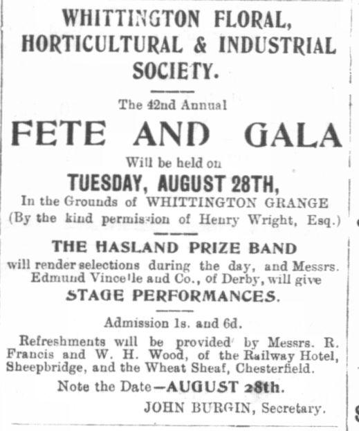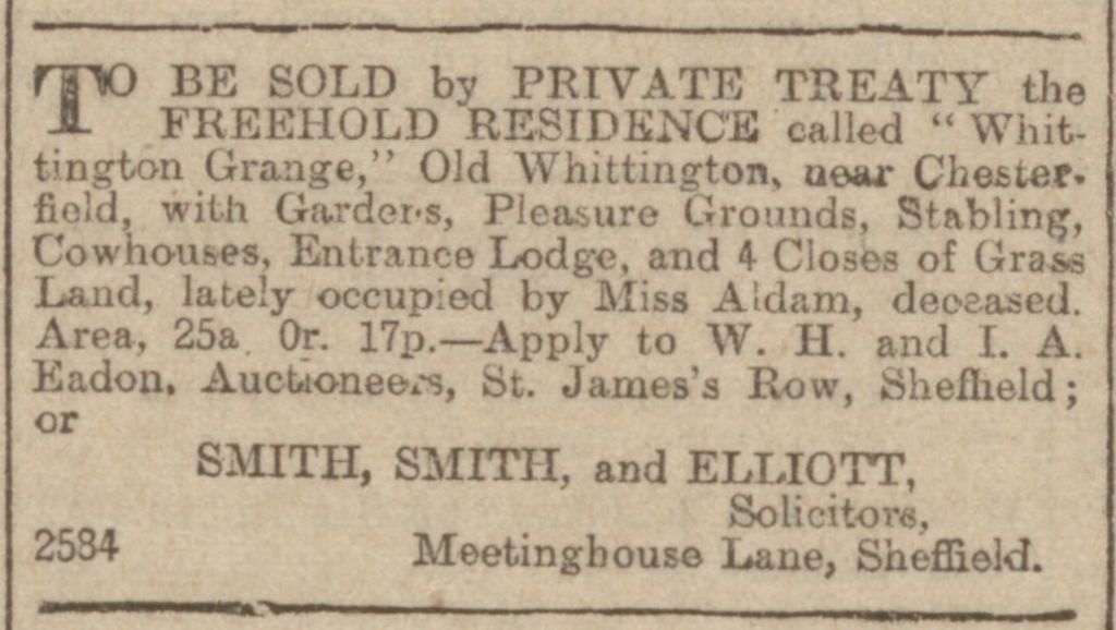 In 1902 he was advised by his doctors to move away from Sheffield to the country and he chose Whittington Grange, which was up for sale after the death of Miss Aldam. The advert for the sale of Whittington Grange was posted in the Derbyshire Times 31 May 1902. It was quite a large estate 25 acres 0 roods and 17 perches is roughly just over 25 football pitches.