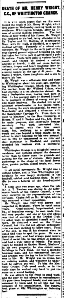 Henry Wrights obituary in the Eckington Woodhouse and Staveley Express 30 August 1913